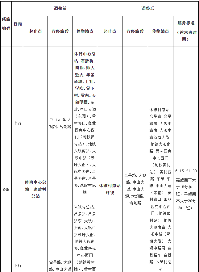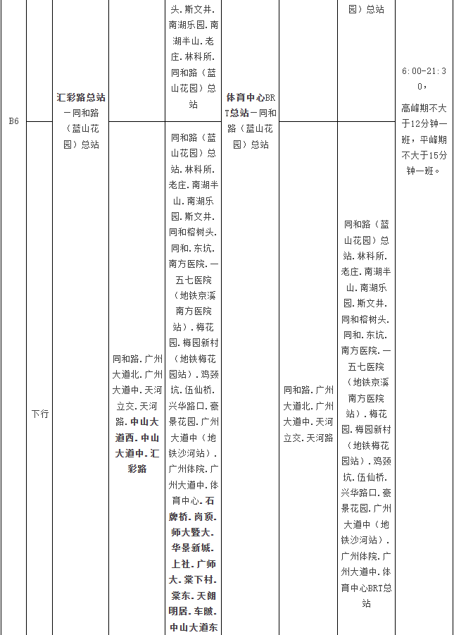 二、环球汽车B6路由汇彩路总站至同和路(蓝山花坛)总站更始为体育中心BRT总站至同和路(蓝山花坛)总站。