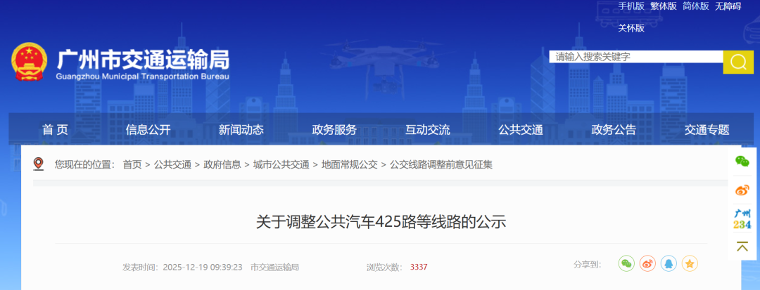 12月19日,广州市交通运载局发布《对于更始环球汽车425路等清爽的公示》。为优化公交线网布局,环球汽车425、444路盘算推算更始行经路段及站点,环球汽车岑岭快线72、884、201、803、327A路盘算推算暂停运营。